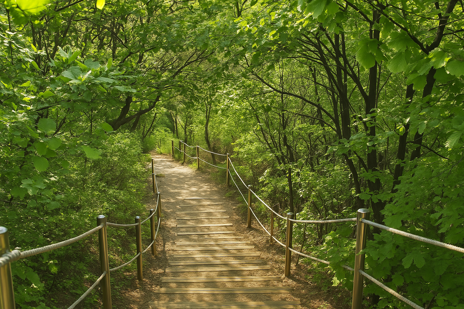 첫 오르막 이후 경사가 거의 없고, 흙길과 나무 계단이 교차합니다.