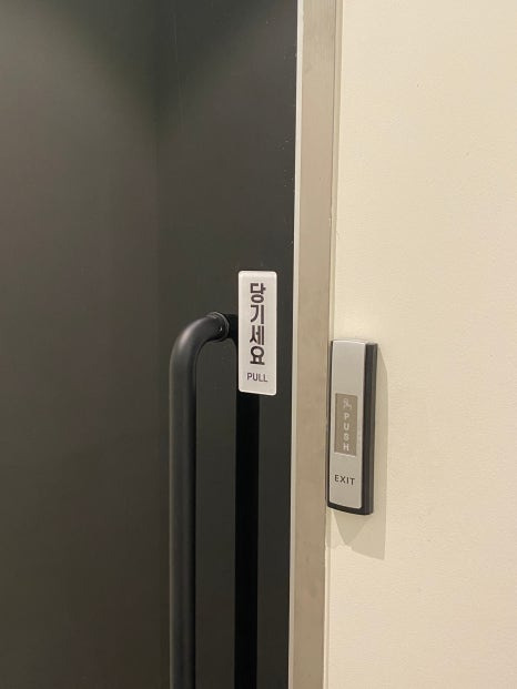 손잡이 오른편 버튼을 눌러 문을 열고 나가주세요!