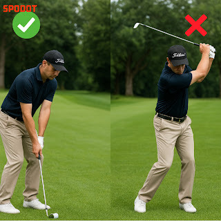 ⏱ 짧은 백스윙 → 긴 백스윙은 잔디 저항으로 리듬 깨짐, 반 스윙으로 강한 임팩트