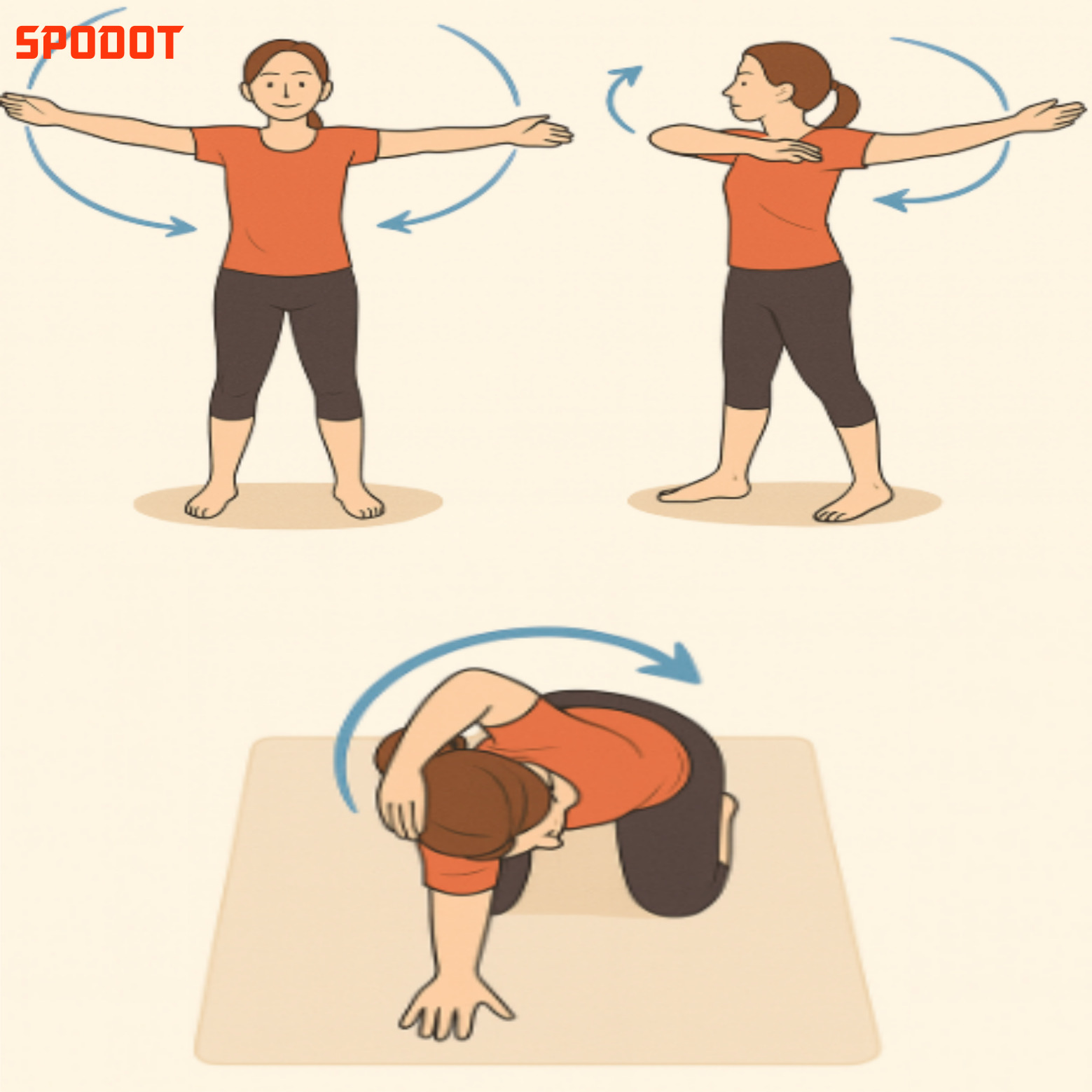 👉 방법 : 양팔을 크게 원을 그리며 앞으로 10회, 뒤로 10회 돌립니다. 작은 원 → 큰 원 순서로 진행하세요.