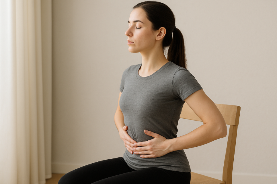 · 등을 펴고 앉거나 선 자세에서, 숨을 들이마신 후 배꼽을 등 쪽으로 당기며 5초 유지
