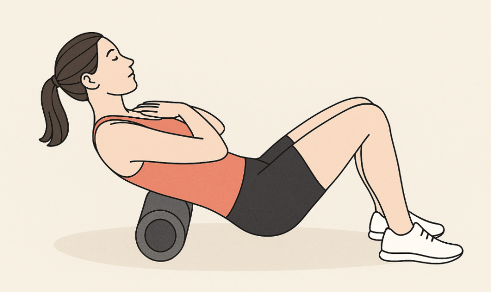 · 등을 폼롤러에 대고 누운 후, 팔을 가슴 위로 교차해 몸을 살짝 들어 올려 천천히 위 아래로 롤링합니다.