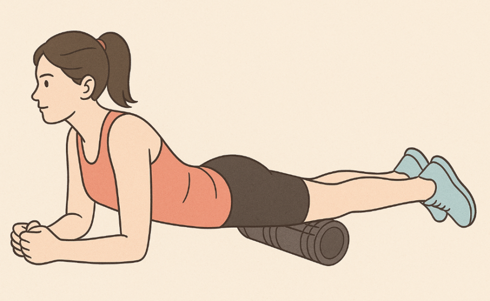 · 엎드린 상태에서 폼롤러를 허벅지 앞에 두고 팔꿈치로 몸을 지탱해요.