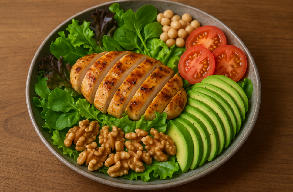 단백질(닭가슴살, 생선) + 곡류, 과일
